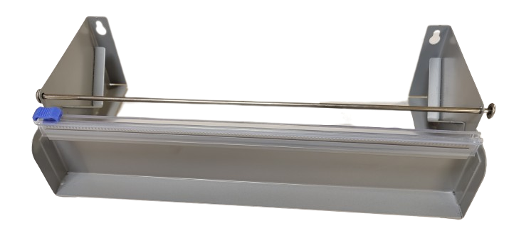 Metallinen kelmuteline 30cm rullalle. Pöydälle tai seinään asennettava. Erillinen muovisuoja leikkaajalla.