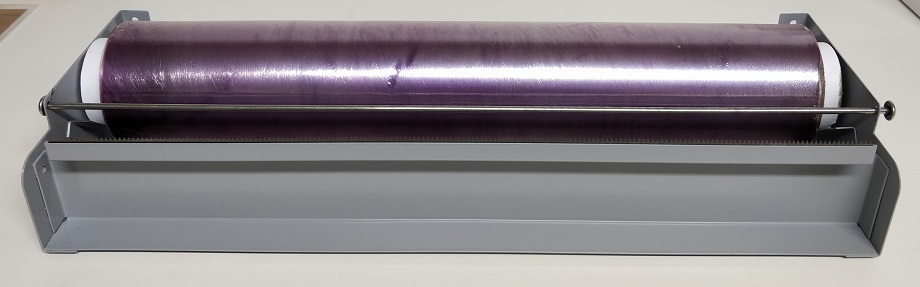 Metallinen kelmuteline 45cm rullalle. Pöydälle tai seinään asennettava. Erillinen muovisuoja leikkaajalla.